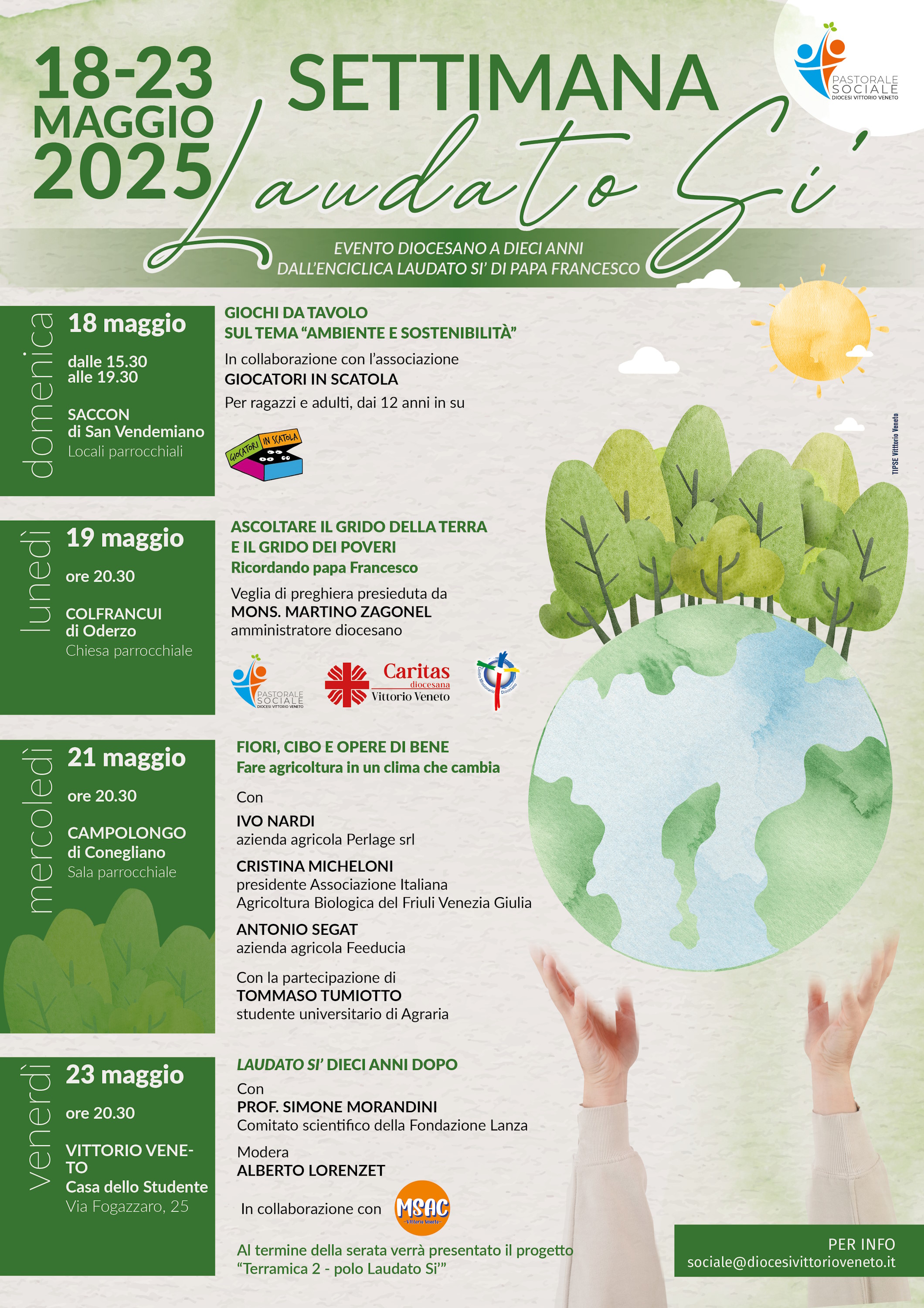 «Inquinamento e cambiamento climatico, il problema delle risorse idriche, la preservazione della biodiversità, il degrado della vita sociale, la crescita di “in-equità” tra Nord e Sud del mondo, il paradigma “tecnocratico” e il modello dell’ecologia integrale: sono alcuni tra i maggiori temi che papa Francesco ha inteso affrontare ormai dieci anni fa con l’enciclica Laudato Si’» – ricorda don Andrea Forest, delegato dell’Ufficio diocesano per la pastorale sociale e la cura del creato. Proprio tale Ufficio ha voluto fortemente questa proposta e cura ora la regia degli eventi che si svolgeranno in varie parti della Diocesi vittoriese dal 18 al 23 maggio.