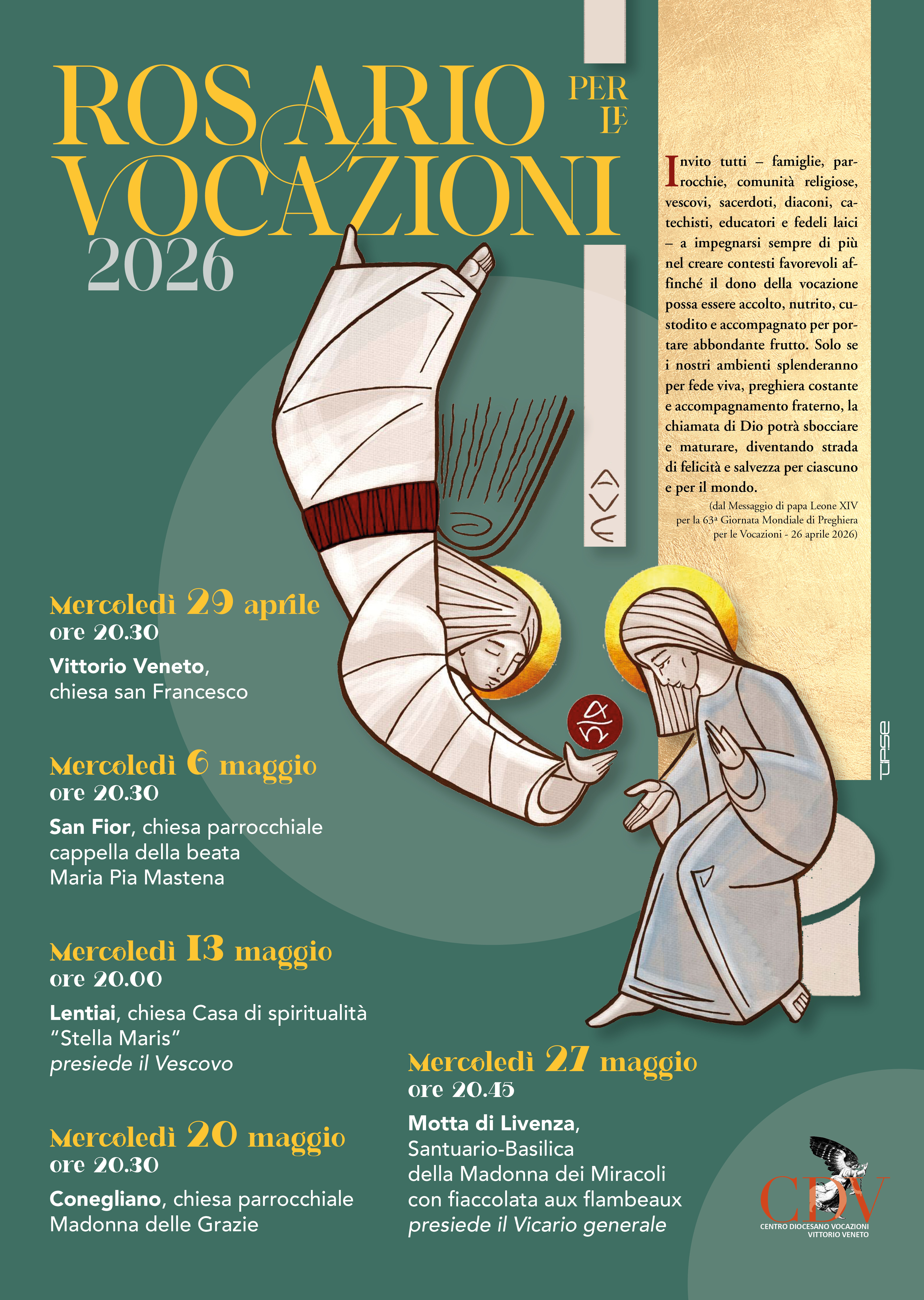 Dal 2020, in sostituzione della Veglia diocesana per le vocazioni, il Centro Diocesano Vocazioni nei mercoledì di maggio propone l’iniziativa del Rosario per le vocazioni in diverse zone della diocesi.