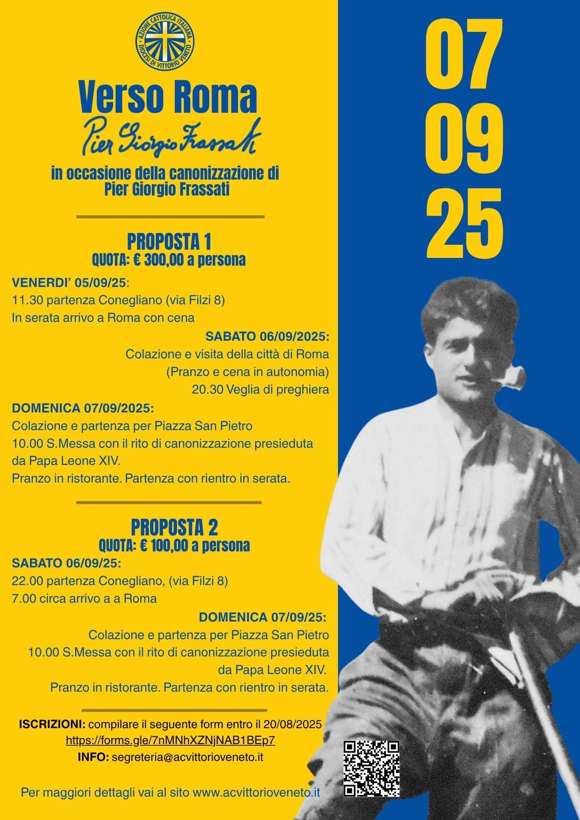 L'Azione Cattolica diocesana, in occasione della Santa Messa di Canonizzazione dei Beati Carlo Acutis e Pier Giorgio Frassati, presieduta dal Santo Padre domenica 7 settembre alle ore 10.00 in Piazza San Pietro, ha organizzato due proposte per la partecipazione alla celebrazione: