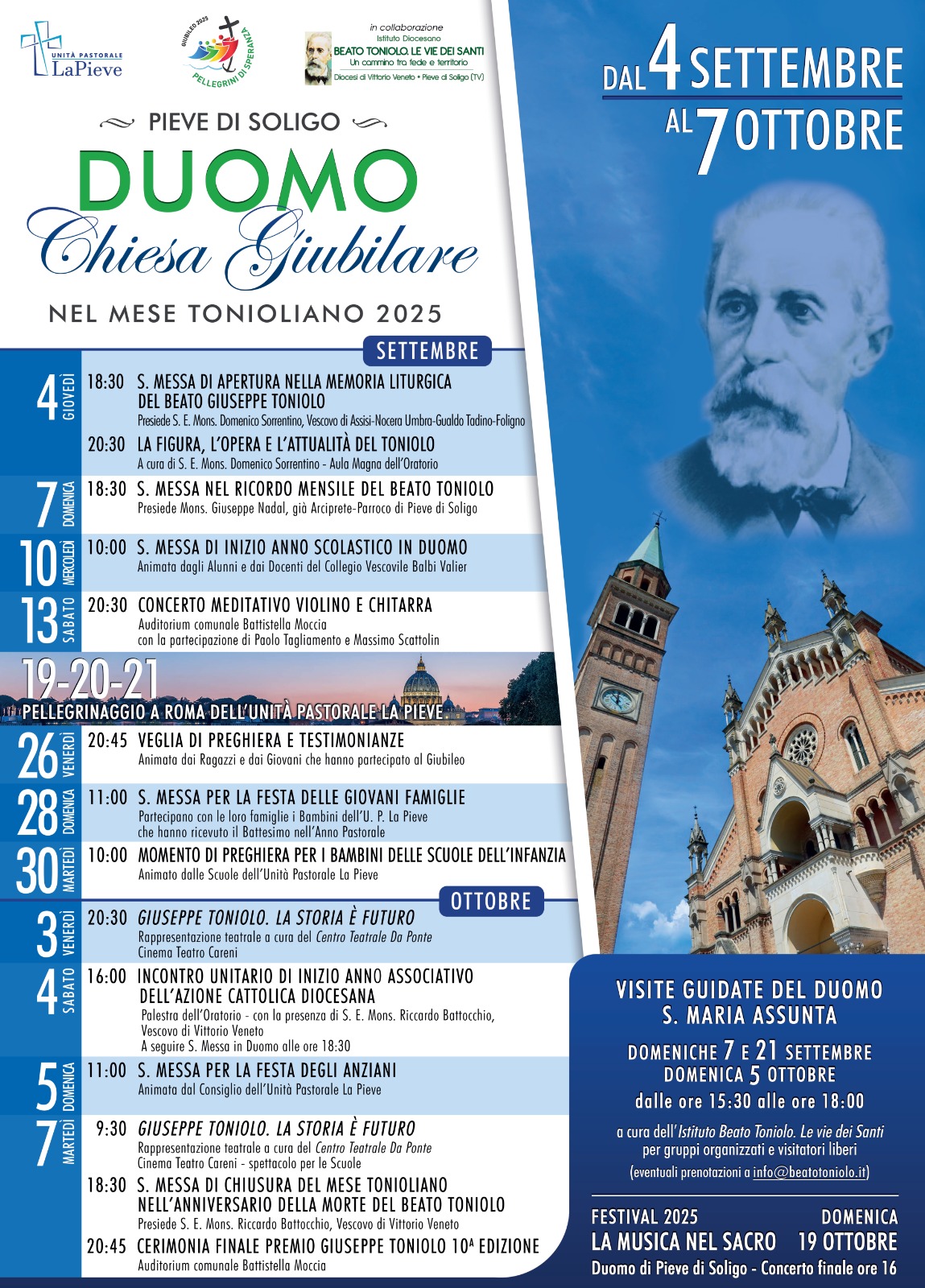 Un mese intero dedicato alla memoria e alla devozione del beato Giuseppe Toniolo nel Duomo di Pieve di Soligo che diventa Chiesa Giubilare e vive in questa dimensione locale la straordinaria esperienza del Giubileo 2025: è questo il significato dell’importante iniziativa ecclesiale promossa dall’Unità pastorale “La Pieve”, in collaborazione con l’Istituto Diocesano “Beato Toniolo. Le vie dei Santi”, che vedrà lo svolgimento di un ricco calendario di appuntamenti nel Mese Tonioliano che va dal 4 settembre, ricorrenza della memoria liturgica del beato Giuseppe Toniolo, al 7 ottobre, giorno anniversario della scomparsa del grande sociologo ed economista cattolico nato a Treviso il 7 marzo 1845, morto a Pisa il 7 ottobre 1918, sepolto nel Duomo pievigino e salito ufficialmente agli onori degli altari nella cerimonia solenne svoltasi il 29 aprile 2012 a Roma, nella basilica di San Paolo fuori le Mura.